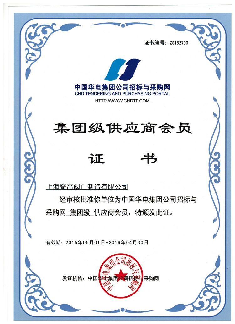 2019-12-18 關注次數:2015年5月1日,上海奇高閥門制造有限公司(http://m.ikworld.cn)經過中國華電集團公司招標與采購網的嚴謹的審核,以過硬的資質力量獲得了中國華電集團公司招標與采購網的集團級供應商會員證書。特此祝賀。經過中國華電集團公司招標與采購網的嚴謹的審核,以過硬的資質力量獲得了中國華電集團公司招標與采購網的集團級供應商會員證書。特此祝賀。經過中國華電集團公司招標與采購網的嚴謹的審核,以過硬的資質力量獲得了中國華電集團公司招標與采購網的集團級供應商會員證書。特此祝賀。