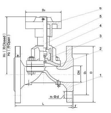 DN | 公稱壓力 | 工作壓力 | L | D | D1 | n-Фd | f | H1 | H2 | D0 | 質(zhì)量 Kg |