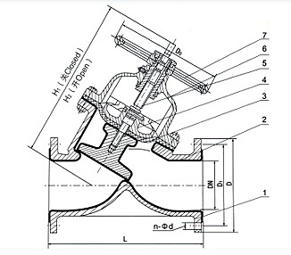 部件列表: 1、閥體 2、閥體襯里 3、隔膜 4、閥瓣 5、閥桿 6、閥蓋 7、手輪