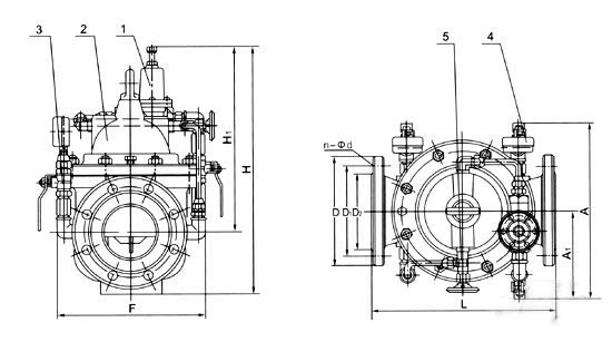 當閥門從進口端給水時,水流過針閥進入主閥控制室,出口壓力通過導管作用到導閥上。當出口壓力高于導閥彈簧設定值時,導閥關閉。控制室停止排水,此時主閥控制室內壓力升高并關閉主閥,出口壓力不再升高。