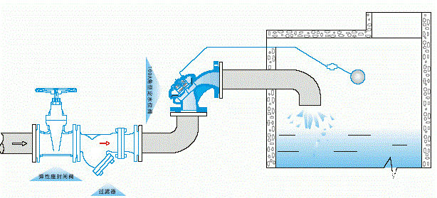100A角型定水位閥是一種隔膜式調節水箱和水塔液面高度的閥門。閥門由一特殊強化尼龍膜片將其分為上下兩個腔室,當液面達到設定位置時,浮球導閥關閉,上腔壓力大于下腔,閥門關閉,即停止供水.當液面下降超過預設位置,浮球導閥開啟,上腔壓力小于下腔壓力,閥門開啟.閥門向池內供水。角型定水位閥安裝方便,可省去管道彎頭,節省安裝空間。該閥保養簡單、靈活耐用、液位控制準確度高,水位不受水壓干擾且關閉緊密不漏水,性能可靠、成本低。浮球可隨水池的高度和距離安裝。