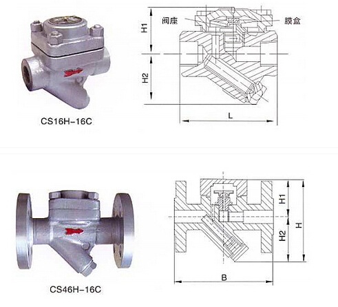 CS16H、CS46H膜盒式蒸汽疏水閥(蒸汽壓力平衡式)是目前 上常用的新型節(jié)能型疏水閥。膜盒式蒸汽疏水閥的反應(yīng)非常靈敏,工作時(shí)閥前存有高溫凝結(jié)水,無(wú)蒸汽泄漏,節(jié)能效果顯著。