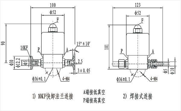 GDC-Q5型電磁高真空帶充氣閥連接在高低真空系統(tǒng)上,該閥通電閥板打開,同時封閉充氣口,將P、A端管路接通;斷電時閥板關(guān)閉,切斷P、A端管路,保證系統(tǒng)的真空度,同時打開充氣口,通過F端向A端充氣。